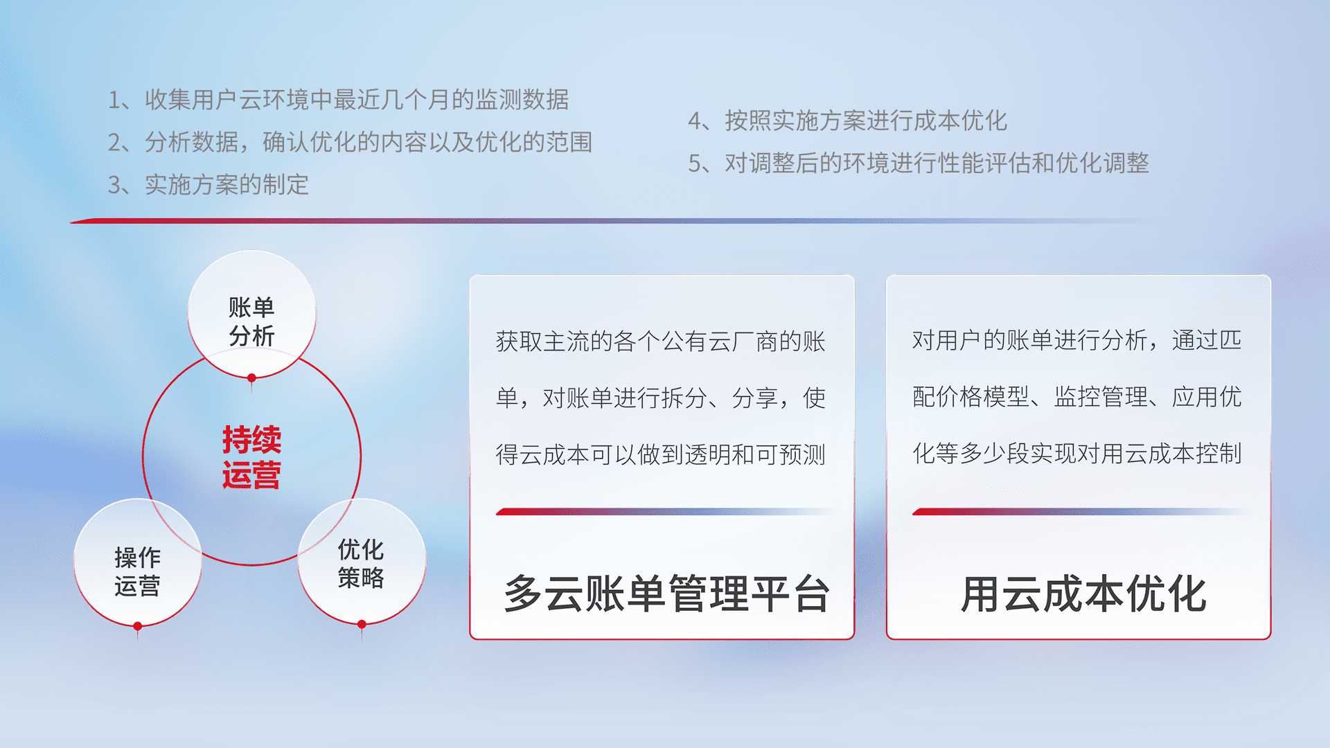 通过多云纳管,,,以统一的资源数据模型把客户的云资源进行抽象和封装,,进而实现对多云资源的统一操作,,,,保障云资源管理的可靠性、、、、稳定性与可用性。。。量身定制化运维内容,,配置、、开发运维、、、、补丁管理、、、、备份、、、、监控、、、、认证和访问管理、、审计和日常巡检等,,,保障在用云过程中的可靠度,,稳定度以及高可用率。。。